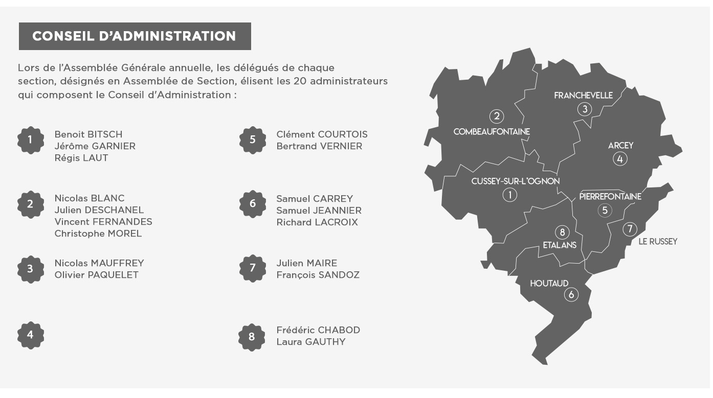 Les 20 administrateurs du Conseil d'Administration et les 6 administrateurs de Région de chaque section composent les Comités de Région Nord, Ouest, 1er Plateau et 2ème Plateau.